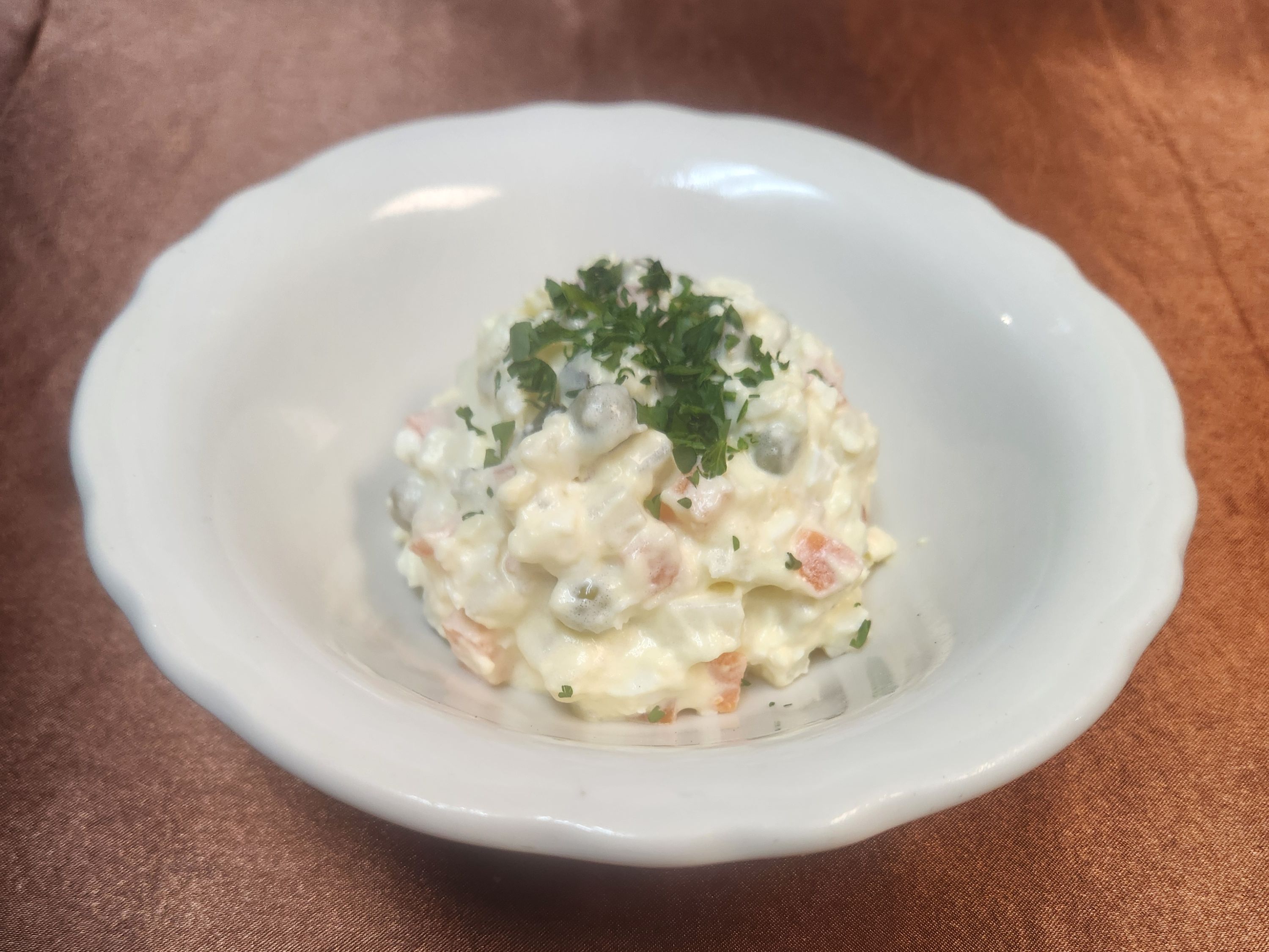 Potatoes, eggs, carrots, pickles, peas, chicken and mayo