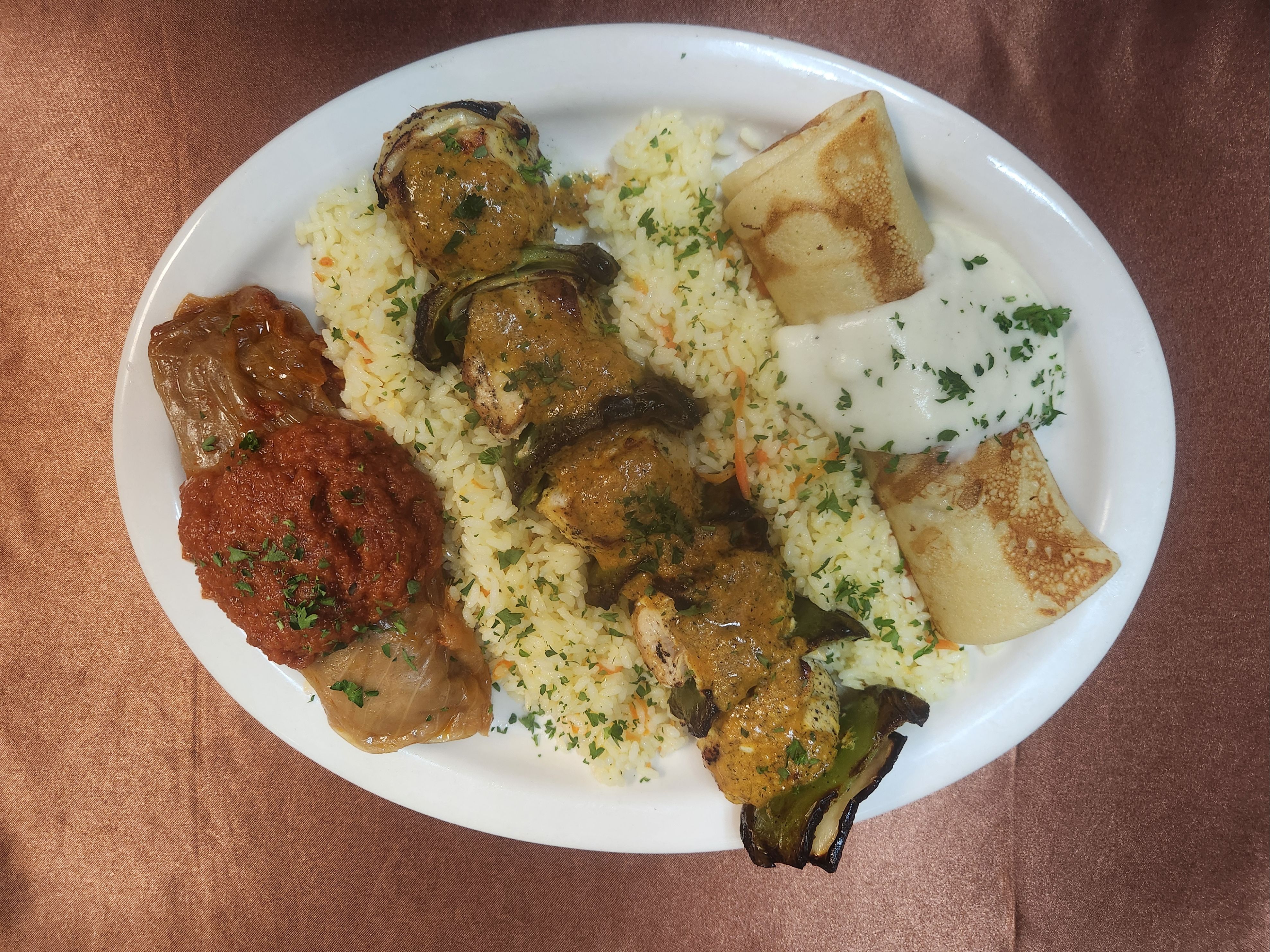 This platter includes one cabbage roll, one chicken breast kebab, and one chicken blintz served on afresh bed of our homemade rice. It's a great opportunity to taste three popular dishes at once!
