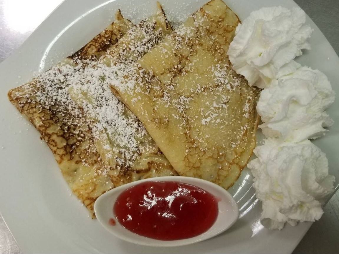 Delicate crepes dusted with powdered sugar, served with dollops of whipped cream, preserves, chocolate and caramel.